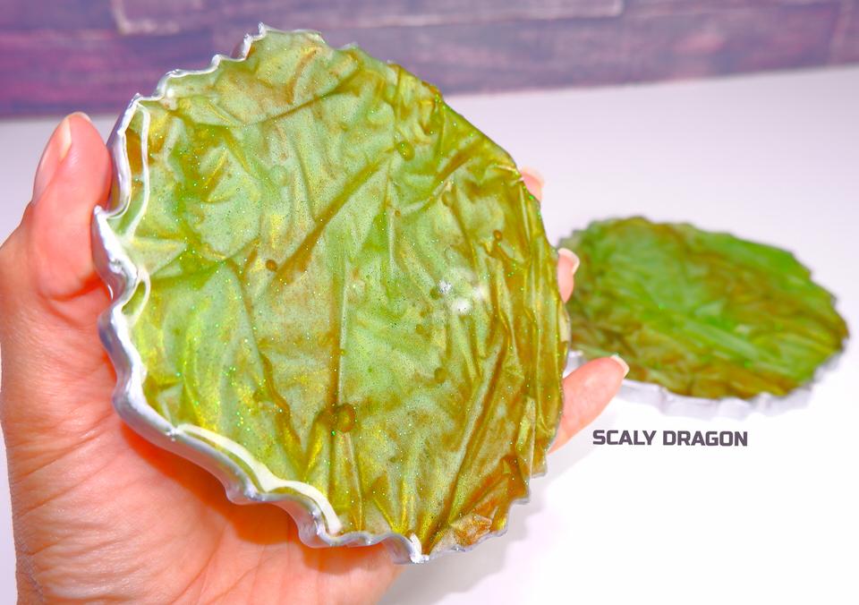 Una vez hecho esto procedemos a la ultima colada de resina transparente a la cual le mesclare un poquito de escarcha o purpurina en color verde.