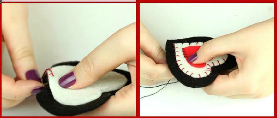 Cuando tengas los tres corazones de fieltro comienza a coser el mediano con el hilo del color del corazón pequeño. Luego cose el más pequeño de los tres encima con el hilo del corazón más grande. ¡La combinación es ideal!