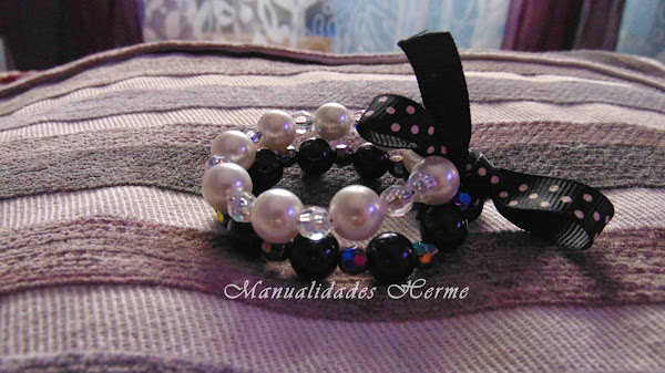 Materiales: Bolas en blanco y negro, abalorios(transparentes y negros) y silicona elástica y un lacito.