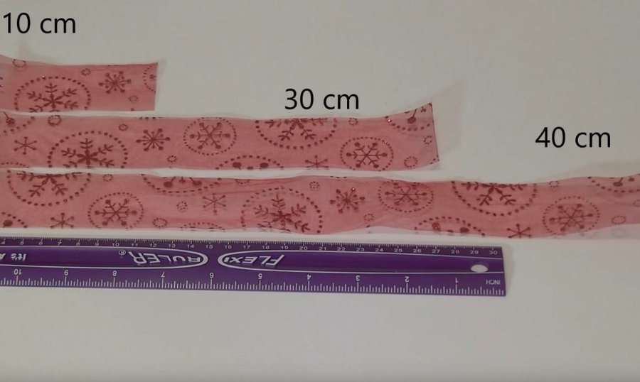 Para hacer el lazo debes cortar tres tramos de listón de las siguientes medidas. Une los extremos y pégalos y sujétalos con silicona y alambre.