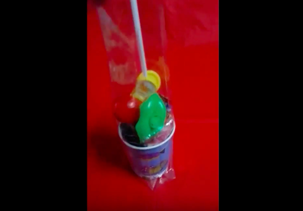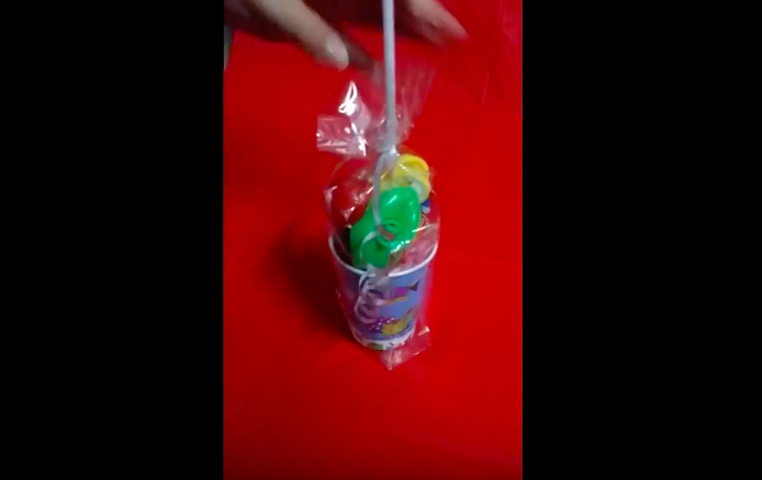 2. A continuación colocamos en el centro un palo para globo y vamos rellenando el vaso de regalitos, chuches, globos hasta arriba.
