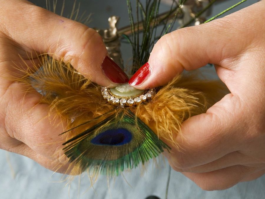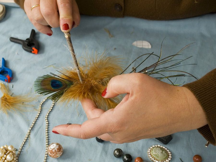Aquí tenemos nuestro elegante broche de plumas. Hemos elegido marabú y pavo real, dos variedades que ofrecen infinidad de combinaciones, ya que el marabú se deja teñir bien en muchos colores. ¡Veamos el montaje paso a paso!