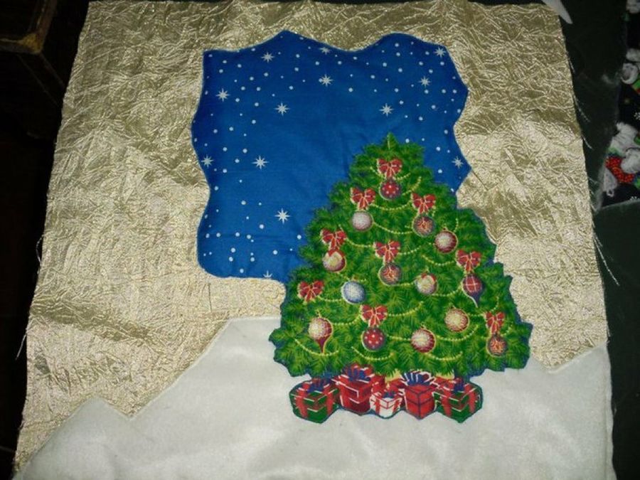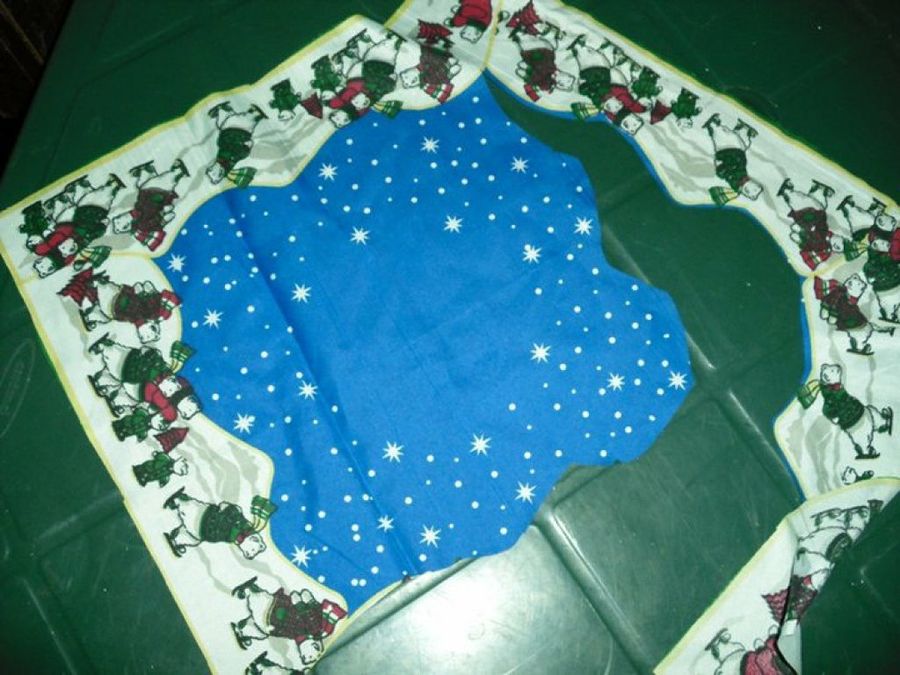 "Con peluche polar de color blanco simulé la nieve, fijé con alfileres y pasé costura zigzag sencillo, luego cosí en el borde de la nieve lentejuelas y mostacilla blanca".