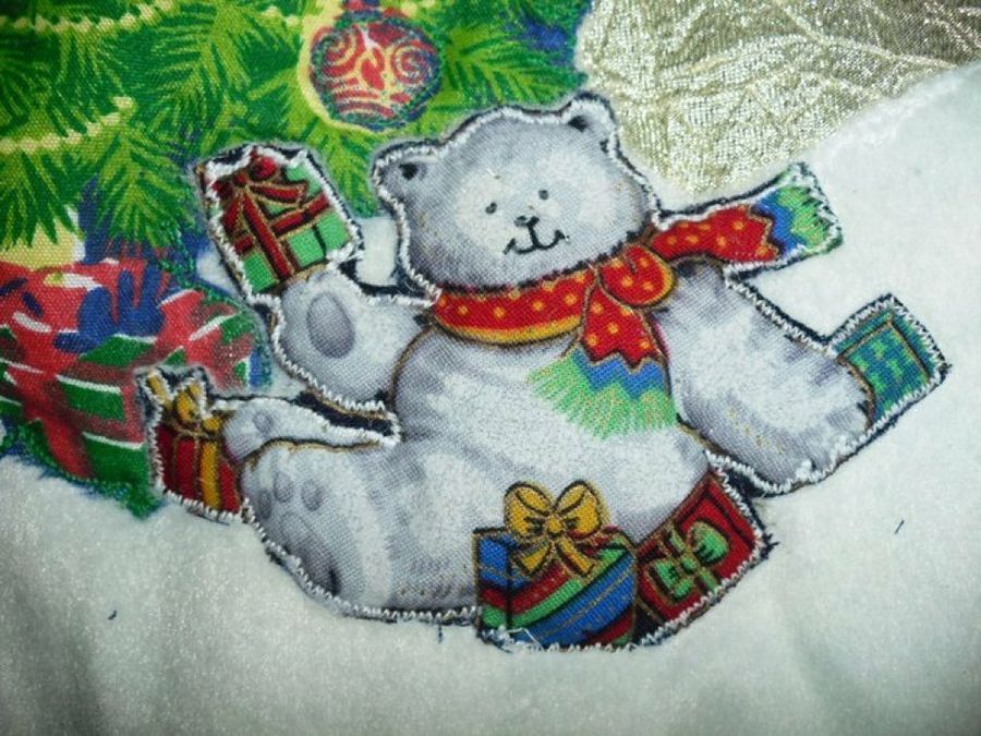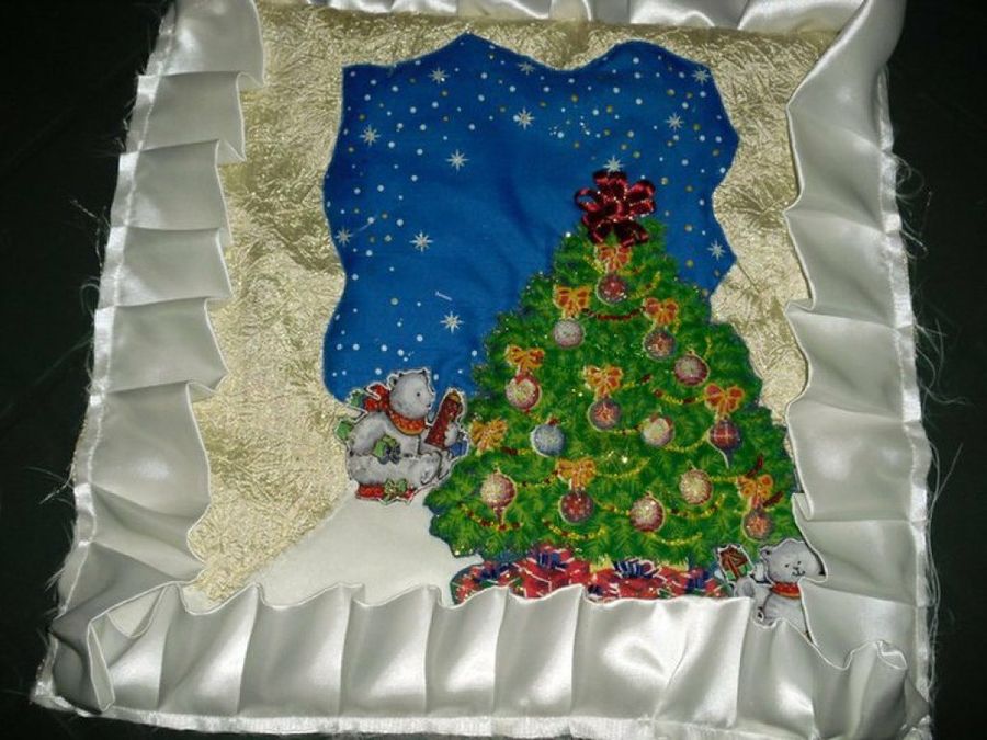 ¡El precioso cojín está casi acabado! La artista completa el fondo para el arbolito y los ositos con pintura para tela, escarchada. Sólo falta poner un lacito color vino tinto en el extremo del arbolito, coser un borde, con pliegues ordenados... ¡y empezar un nuevo cojín, a juego con el primero que ha salido divino!