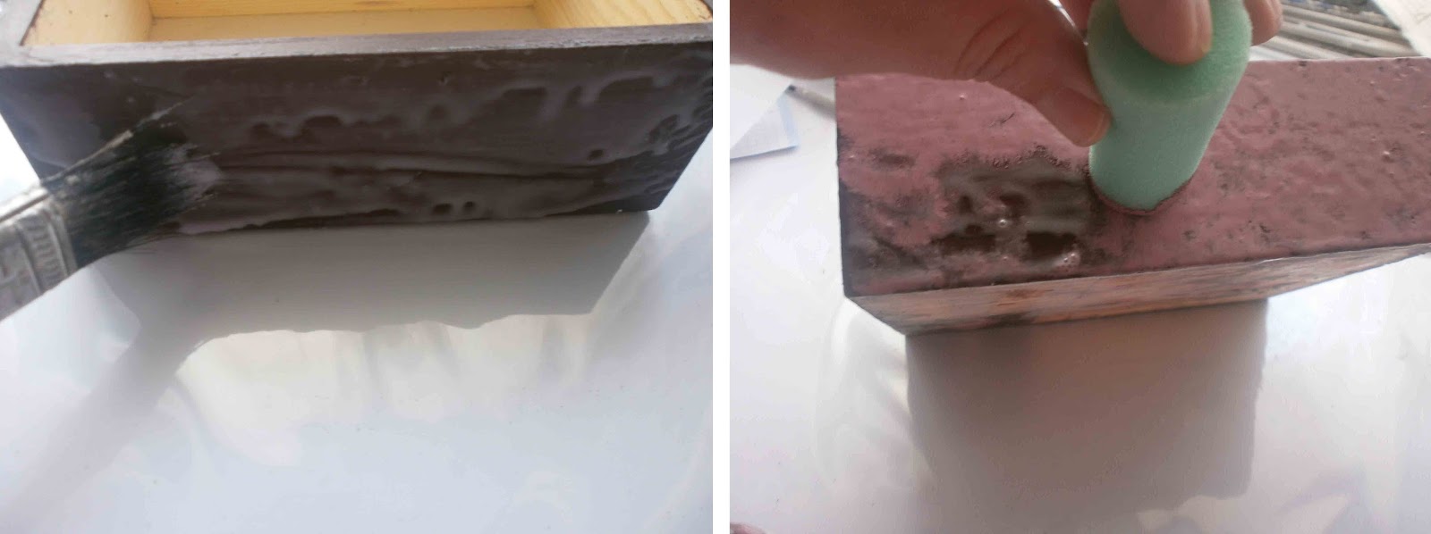Una vez seco se aplica bastante cola y sin dejar secar la cola se pinta con la esponja y dando toquecitos el segundo color de pintura elegido.