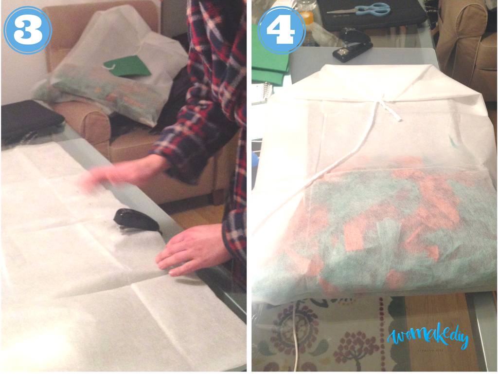 Para hacer el relleno, es decir, para simular las hojas de té: haz jirones el papel de seda. No hace falta que los cortes de manera uniforme y, de hecho, puedes arrugarlos para darles más volumen. Una vez tengas todo el relleno, divídelo en 2 para tener relleno para las dos bolsas del disfraz.