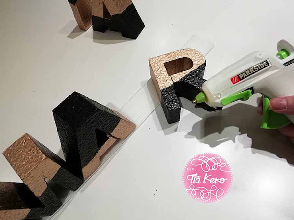Cuando las letras están bien secas, las pegamos con la pistola de silicona caliente en una base que tenga el mismo ancho y largo que la palabra completa.