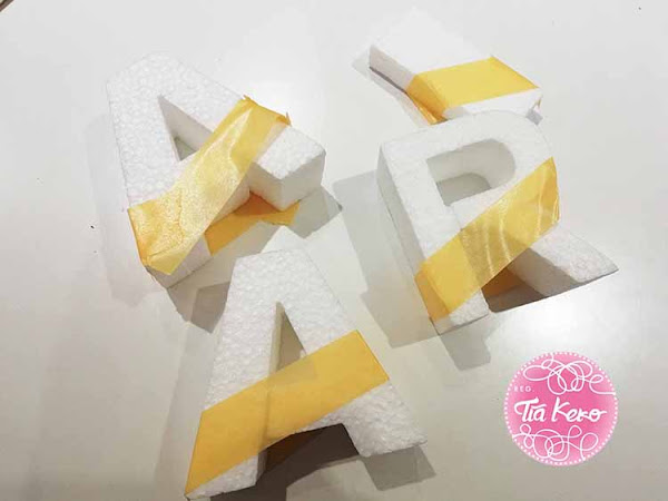 A nosotras se nos ocurrió que un combinado negro-oro quedaría muy bonito, así que pusimos la cinta de whasi en cada letra para separar la parte a pintar de negro y la parte a pintar de color oro.