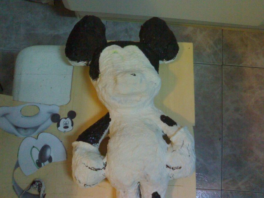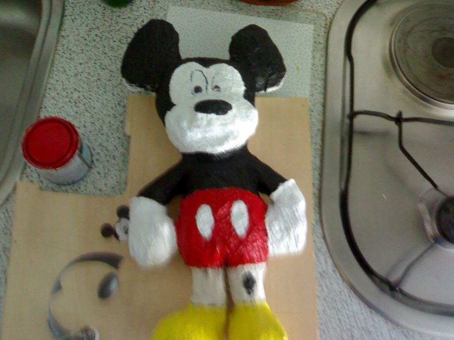 A pesar de su humildad nos permite hacer trabajos verdaderamente deliciosos y alegres. Las hojas de periódico pueden servir como acabado decorativo, o utilizarse como armazón para luego cubrirlo con otro papel más blando, humedecido hasta convertirlo en pasta de modelar. Es lo que ha hecho la forera Ericero con su gracioso Mickey Mouse.