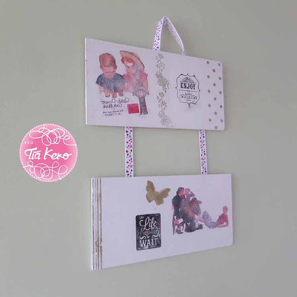 La madera reciclada del perchero proviene de la tapa de una caja de las que se emplean para lotes de productos navideños, la cual encontré al lado de un contenedor. Tras eliminar clavos, grapas y travesaños de madera, lijé toda la superficie, apliqué un tinte de color nogal, sellé con cola de carpintero, apliqué pintura acrílica blanca, volví a lijar y enceré. En el siguiente enlace encontrarás cómo hacer un tablero rústico decapado con imágenes del paso a paso.