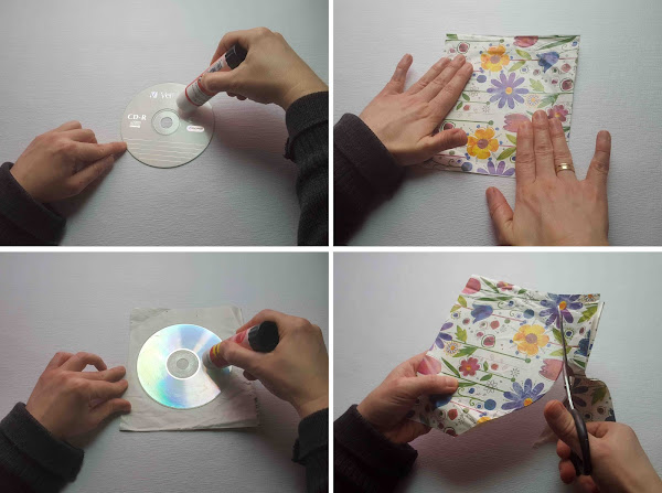 Comenzaremos aplicando pegamento al cd y pegamos papel de regalo encima, repetimos el mismo paso para el otro lado de cd. Después se recorta el papel sobrante.