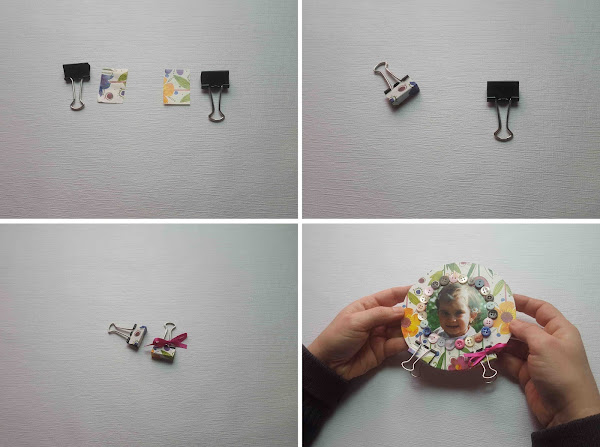 Con dos trozos del mismo papel se decoran los clips y se le pone un lacito. Ahora sólo queda poner los clips al portaretrato para que pueda sujetarse.