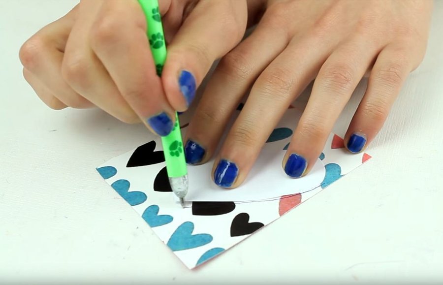 A continuación repasa la plantilla sobre cartulina decorada. Como resultado deberás tener 6 corazones diferentes. Puedes jugar con el estampado o los colores de la cartulina. ¡Tú eliges!