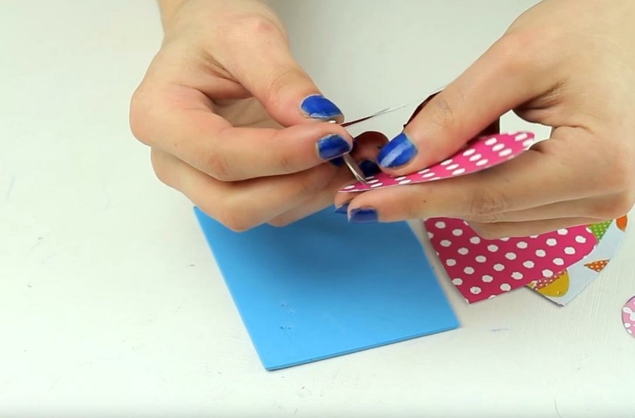 Coloca un trozo de goma eva sobre la mesa y, con ayuda de un punzón, ve haciendo agujeros a todos los corazones. Mide bien para que todos los orificios estén en el mismo lugar.