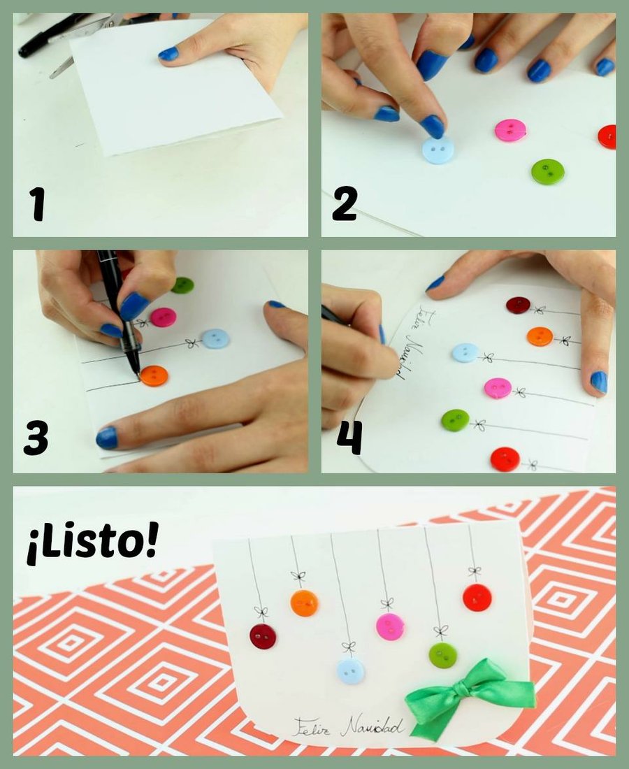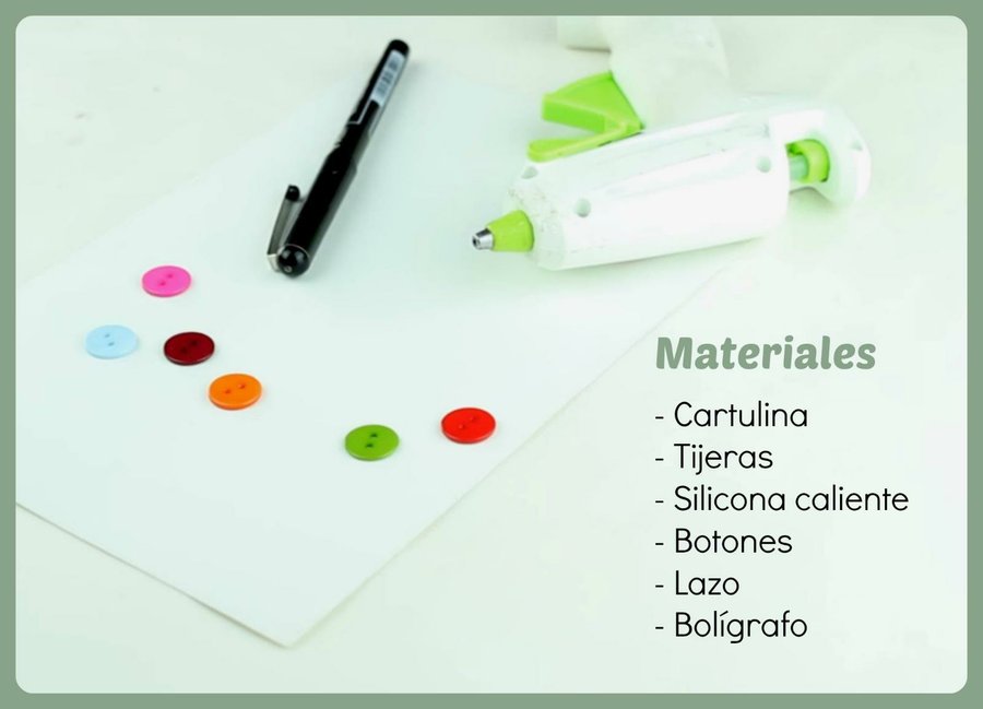 Sencillo, ¿verdad? Como hemos visto en el vídeo, no hace falta ser un artista, porque cualquiera lo puede hacer. Primero hay que doblar una cartulina y que quede a un tamaño cuartilla. Redondea los picos con las tijeras y pega los botones. Dibuja la cuerda de los botones con un bolígrafo o rotulador y solo queda pegar un lazo. Escribe una dedicatoria y sorprende a tu amigo o familiar con ella.