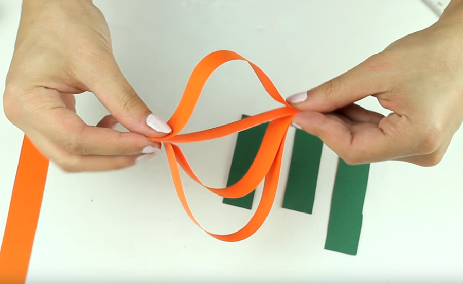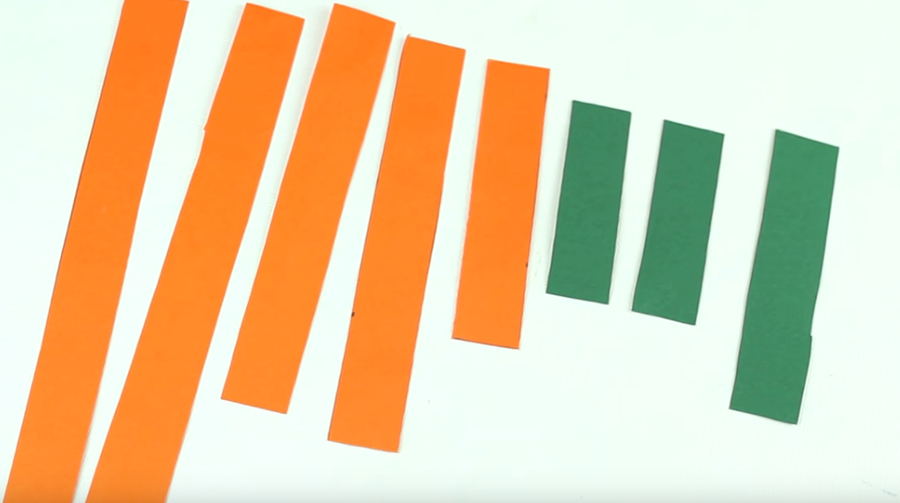 1. Comenzamos recortando varias tiras de la cartulina naranja. En concreto, para cada calabaza necesitamos: