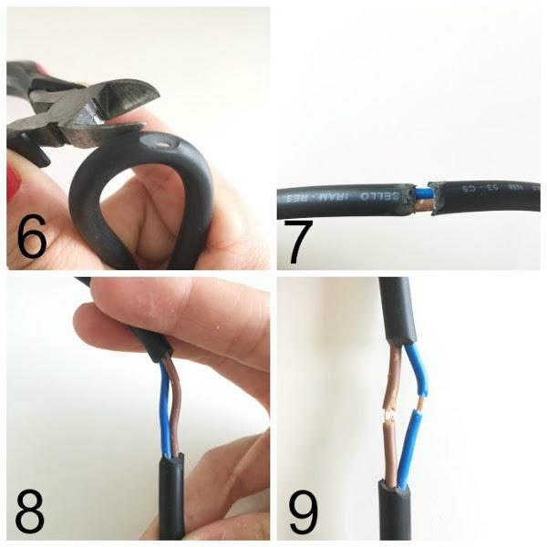 6 y 7. Vamos a pelar el cable (la parte negra) para dejar el cable azul/celeste y el marrón al descubierto.