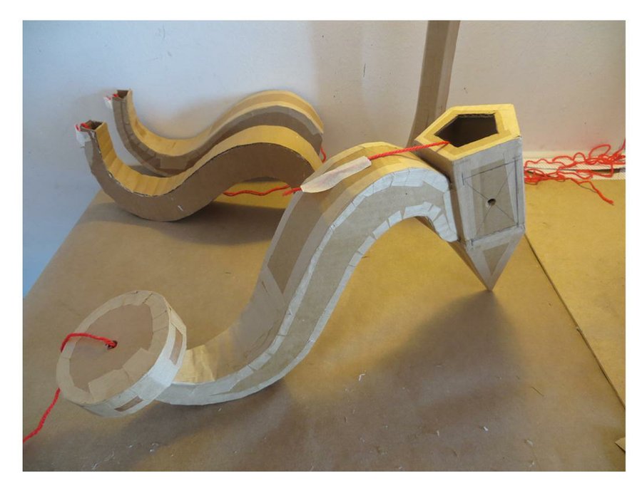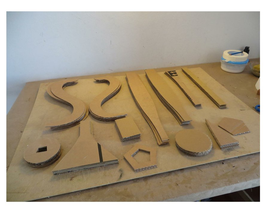 Estas son todas las piezas de cartón cortadas. Las piezas se sujetan con cinta de carrocero por el exterior y se pegan por dentro con silicona caliente.