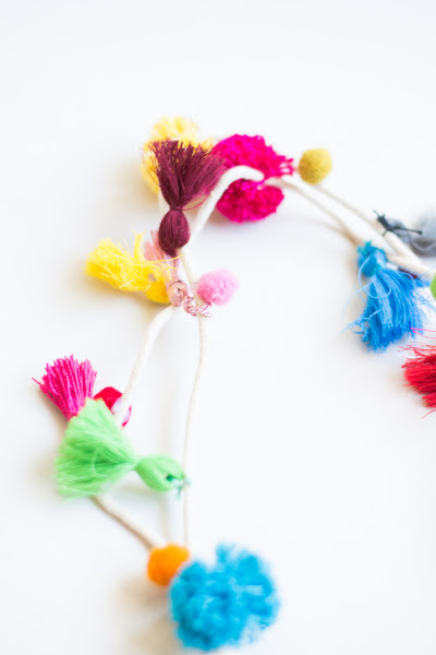 Nada más fácil que hacer varios pompones de colores, mini tassel, e ir pegando tiras étnicas, borlas, y añadir abalorios diferentes.