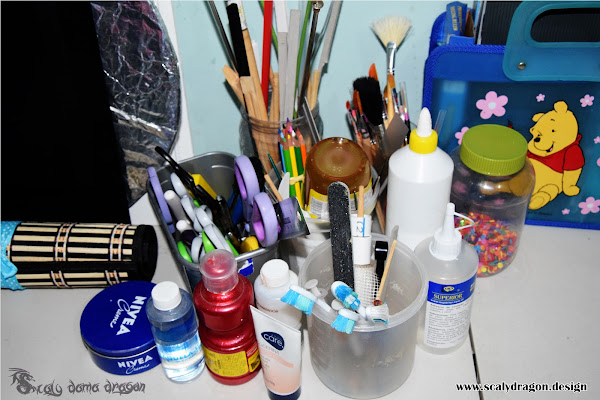 Coloca cada herramienta de acuerdo a su propósito. Por ejemplo, coloca todas las herramientas para cortar en un solo lugar. coloca los pinceles que mas uses en un solo lugar y a la mano.