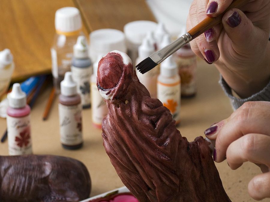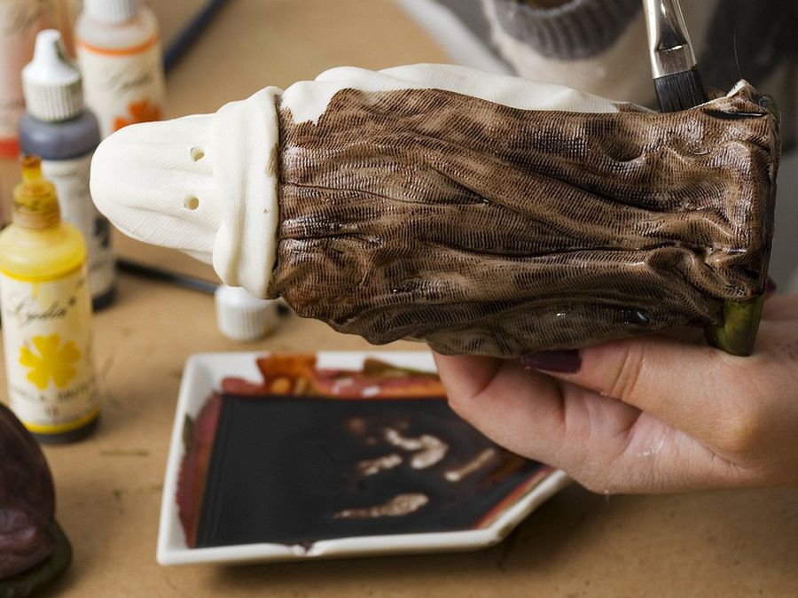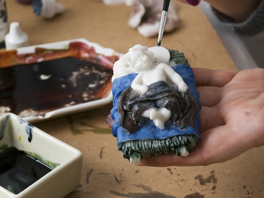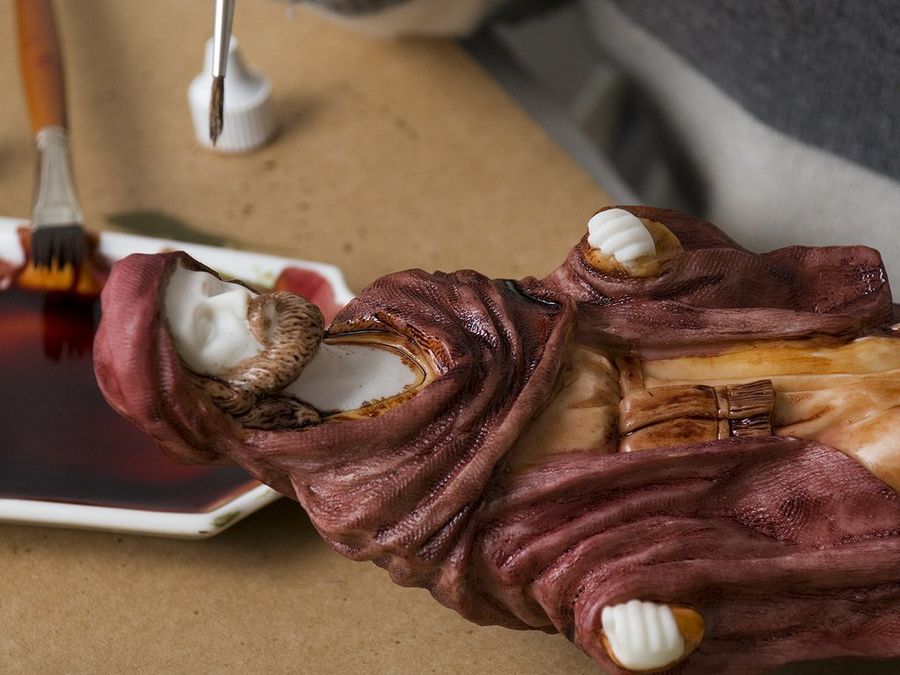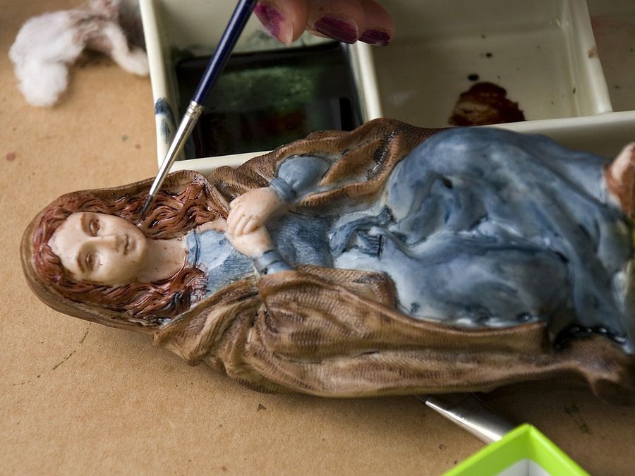 Para el exigente trabajo de las facciones empleamos tonos suaves con un pincel muy fino. Damos luego una somera pátina a todo el conjunto con cera transparente.