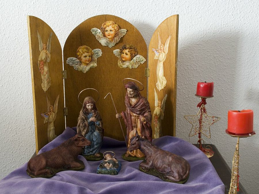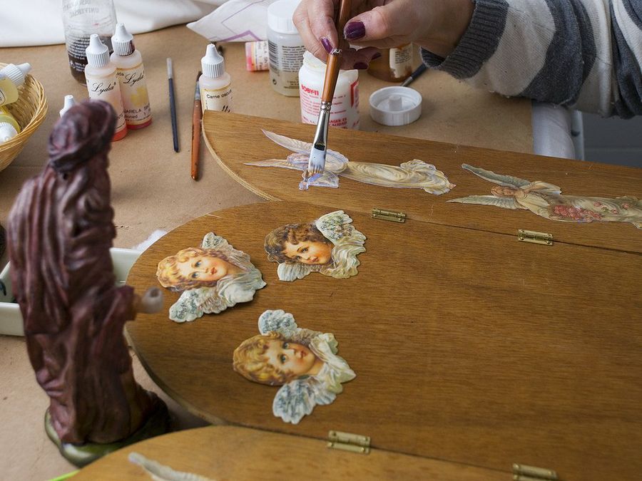 Un retablo en tríptico servirá como fondo para el Nacimiento. Bajo la atenta mirada de San José, lo adornamos con cromos de angelitos, a los que hemos dado forma y relieve con un barniz de manualidades. Después de pegarlos en la madera con cola de carpintero, damos un producto especial que añade textura.