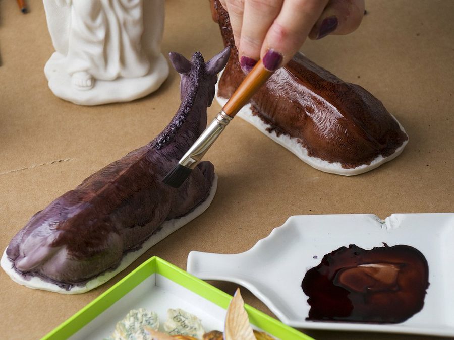 Las acuarelas sintéticas dan un resultado muy satisfactorio en la superficie de resina. Otra ventaja de este material, además del precio, es su dureza: los apéndices de las figuras del Belén, como las orejas de la mula, patas de las ovejas, riendas de los camellos, palos de las zambombas y demás, que van cayendo en acto de servicio con el paso de los años, por más cuidado que se ponga, están a salvo con la resina. Ninguna pieza de barro sobrevive a una caída accidental desde la mesa, algo que las figuras de resina encajan sin inmutarse. Terminamos los animales dando un color verde musgo a la peana.