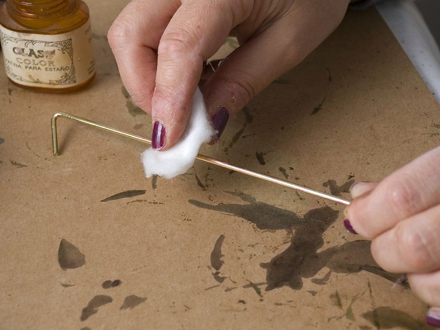 Sólo falta envejecer el cayado de San José, que viene de fábrica con un dorado demasiado reluciente. Después de lijarlo con papel del número 220, lo embadurnamos con una pátina de metales. De esa manera tan sencilla conseguimos que el bastón quede a tono con el artesanal y lujoso Nacimiento ‘de anticuario' que hemos adornado.