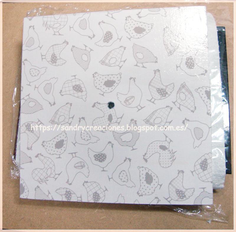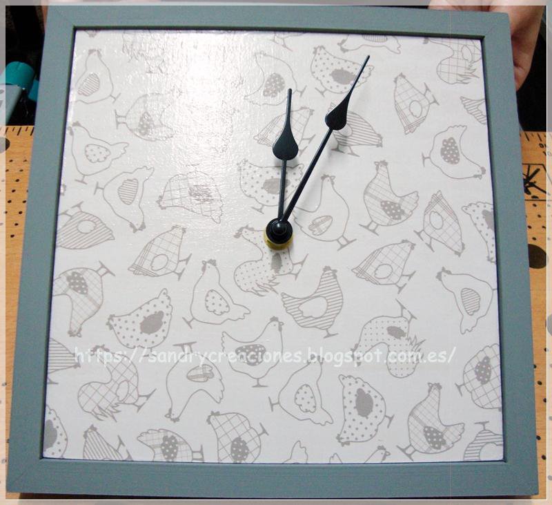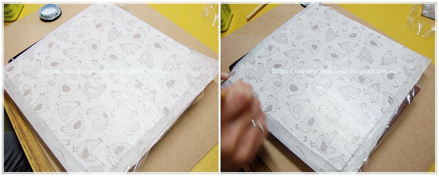 Paso 4. Realizar la técnica del decoupage en la cara de la estructura correspondiente a la superficie del reloj. Para hacer este paso utilizamos papel de decoupage, nosotros usamos uno con motivos de gallinas ya que nos pareció muy adecuado para un reloj de cocina. Seguidamente cubrimos toda la superficie con cola para decoupage, ponemos el papel con cuidado ayudándonos con el pincel mojado en cola de decoupage. Una vez colocado el papel pasamos otra capa de cola para decoupage por toda la superficie intentando quitar las arrugas y burbujas que nos hayan podido quedar. Si hemos dejado un sobrante del papel en el borde, podemos o bien pegarlo en la parte trasera del reloj con cola de decoupage o una vez seco el decoupage cortar el sobrante y lijar con lija fina los bordes del papel para dejarlos bien pulidos.