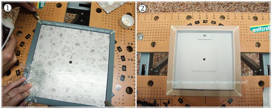 Con toda la estructura general realizada barnizamos la parte trasera y el marco con barniz mate intentado no manchar la parte con la decoración de gallinas que barnizamos anteriormente con barniz satinado (paso 5).