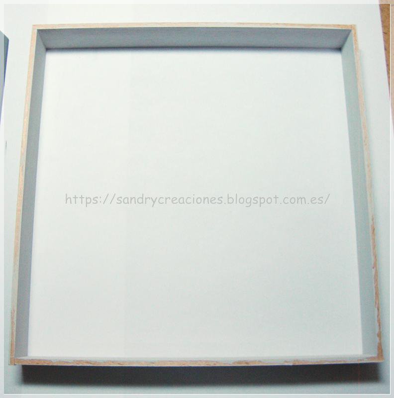 Tras tener las dos piezas cortadas, pegamos el cuadrado pequeño en el centro del cuadrado grande con adhesivo de montaje o cola blanca.