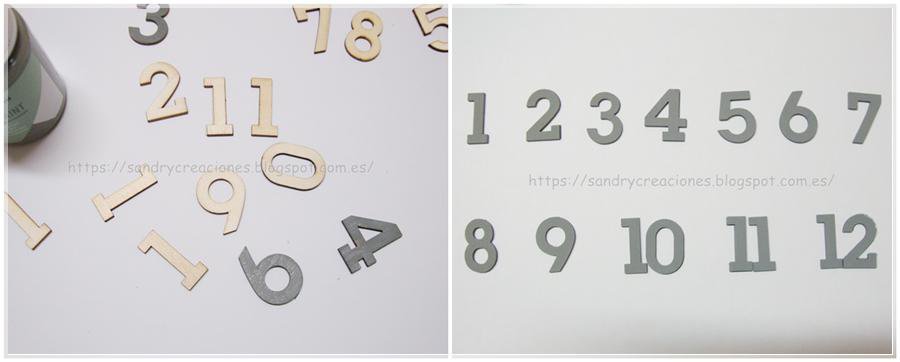 Paso 9. Números del reloj. Para realizar los números que marcaran las horas en el reloj utilizamos números de madera pre-cortados autoadhesivos que podemos encontrar en cualquier tienda de manualidades. Antes de pegarlos los pintamos con dos capas de pintura chalk paint color Vintage y los barnizamos con barniz mate.