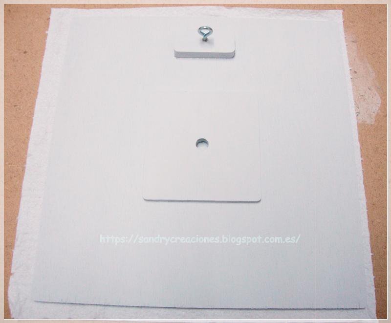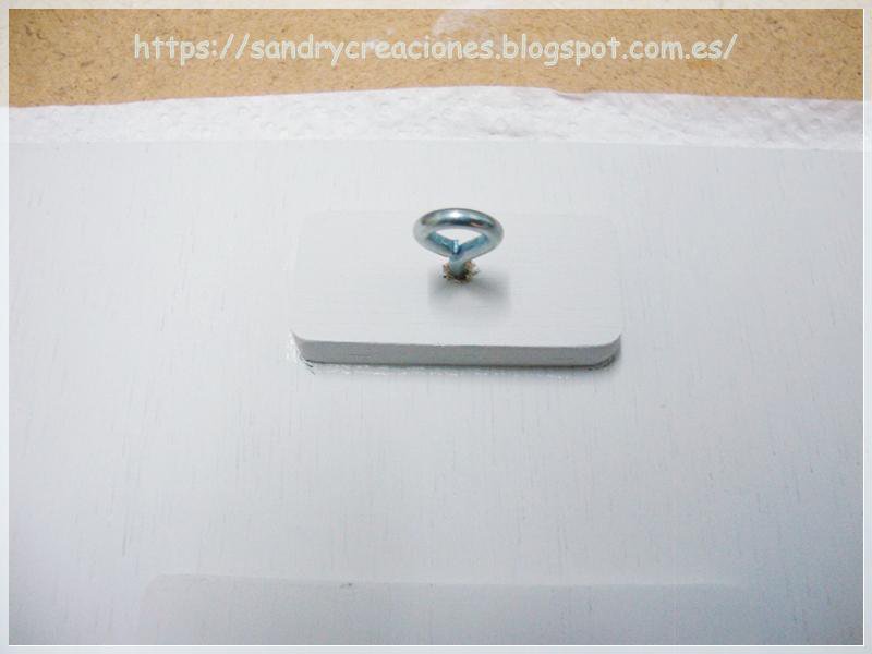Paso 3. Lijar y pintar la estructura resultante de los pasos anteriores. Lijamos toda la estructura primero con lija de grano medio y seguidamente con lija de grano fino para quitar imperfecciones y dejarla bien pulida. Seguidamente pintamos toda la estructura (parte delantera y trasera) con pintura chalk paint de color Sal Ibiza y una vez seca la pintura ponemos una hembrilla cerrada en la parte central de la pieza que habíamos colocado en la parte superior trasera para ese fin.