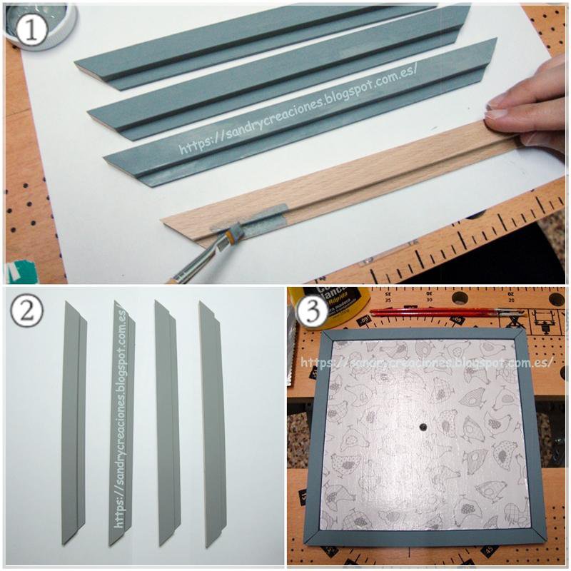 Paso 6. Marco del reloj. Para realizarlo usamos cuatro trozos, con los extremos cortados al bies, del listón con una hendidura (número 2 en los materiales), de manera que la parte corta tenga la medida de la superficie del reloj y encajen bien formando un marco exterior perfecto. Comprobamos que las piezas encajan bien, las pulimos con lija de grano medio y grano fino y le damos una capa de pintura chalk paint de color Vintage a la parte delantera de las piezas del marco. Las dejamos secar bien y las pegamos una a una a la parte trasera de la estructura de nuestro reloj, formando el marco.