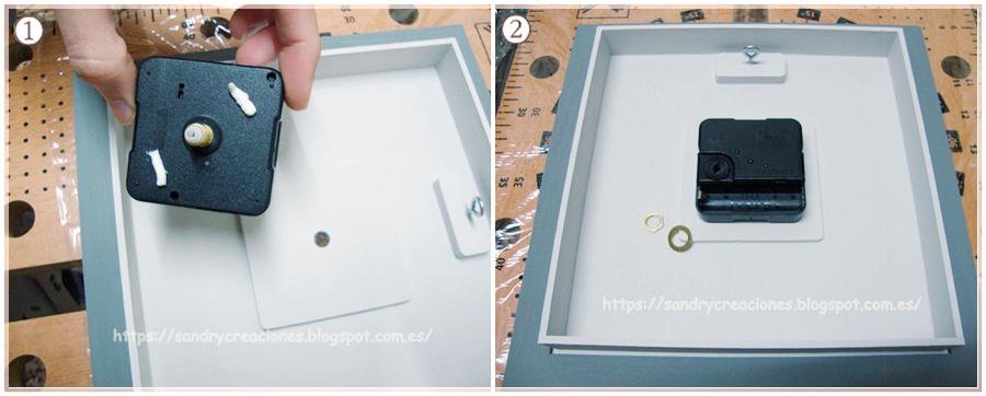 Paso 8. Colocación del mecanismo del reloj y las manecillas. Para colocar el mecanismo del reloj lo primero que haremos será quitar las arandelas que lleva el mecanismo para su fijación, ponerle un poco de adhesivo de montaje en la parte frontal e introducirlo por el agujero que hicimos en la estructura del reloj. Tras esto terminamos de fijar enroscando las arandelas de fijación del mecanismo a través de la parte del eje que sobresale por la parte frontal del reloj.