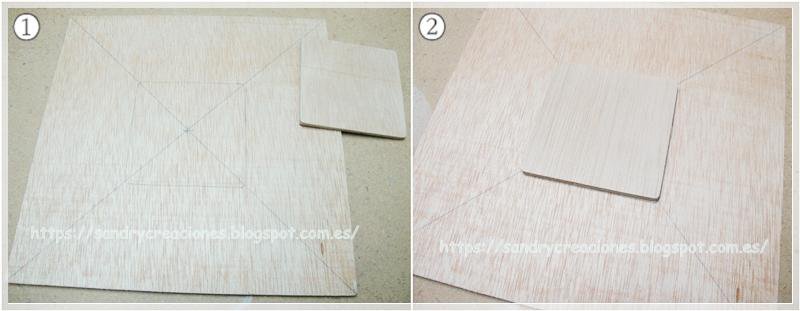 Paso 1. Cortar un cuadrado de lámina de madera de 20,5 cm de lado. En un trozo de lámina de madera marcamos con lápiz y regla un cuadrado de 20,5 cm de lado y con una sierra de marquetería o con una sierra para madera lo cortamos. La medida de este cuadrado de lámina de madera dependerá de la longitud de las manecillas que queramos usar, en nuestro caso, la manecilla larga tenía una longitud total de 9,5 cm, por tanto esa medida multiplicada por dos (19 cm) era la longitud límite que podíamos usar para que la manecilla larga no saliese de la superficie del reloj. Como es mejor no ir justos, nuestra recomendación es que a esa medida le suméis un centímetro y medio más. En nuestro caso 9,5 cm x 2 = 19 cm + 1,5 cm = 20,5 cm.