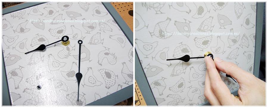 Seguidamente introducimos las manecillas a presión en el eje del mecanismo, primero la manecilla pequeña y seguidamente la grande.