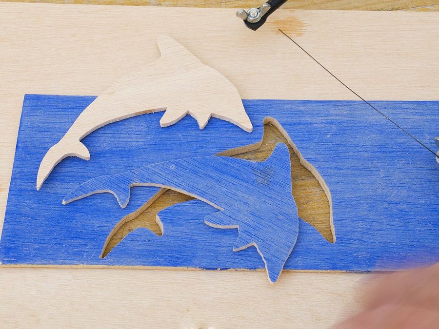 Y de esta forma tan sencilla hemos obtenido con el mismo recorte dos delfines, además de dos tablillas con los huecos perfectos del animal. Podemos combinar esos elementos en un adorno de pared, o en un alegre móvil colgante, jugando con la ilusión de los delfines que aparecen y desaparecen. La misma técnica nos permitirá montar cuatro o cinco tablillas, multiplicando la fauna resultante.