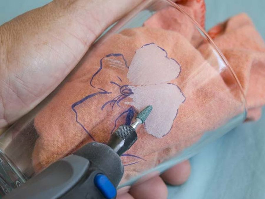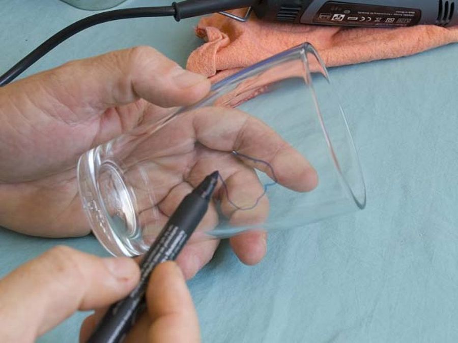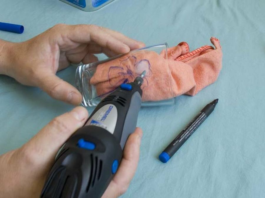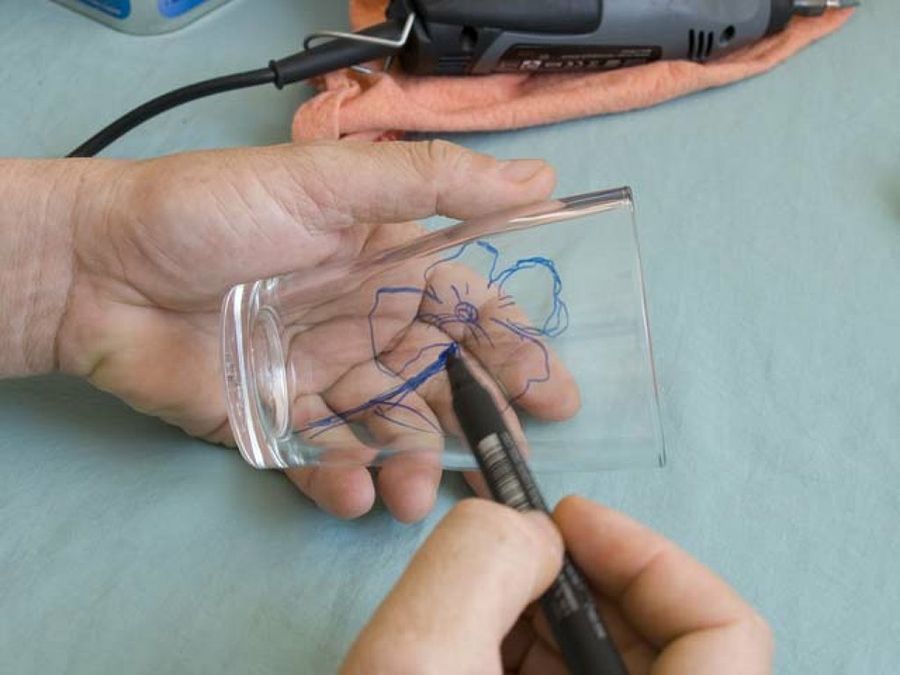 Es de vital importancia comprobar las utilidades del accesorio, porque son muy específicos: el que sirve para trabajar la cerámica resultará inadecuado con la madera. Hay varios utensilios Dremel diseñados para esmerilar, y hemos escogido el más fino.Hacemos un dibujo esquemático en el vaso, con un rotulador apropiado.