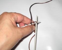 Tambiénse puede tejer un cordón utilizando las agujas convencionales de una sola punta. En este caso, una vez tejidos los tres puntos hay que volver a pasarlos a la aguja de la mano izquierda y tejerlos otra vez del derecho utilizando la hebra que ha quedado en el otro extremo de la labor.