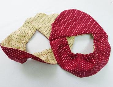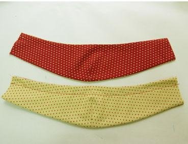 A continuación, emparejamos las taloneras, cada pareja consistirá en una de tejido interior y otra de tejido exterior y las encaramos, las sujetamos con alfileres y cosemos las dos lineas mas largas rematando al principio y al final y damos la vuelta por un extremo, como si fuese un calcetín, planchamos para dejarlo bien plano.