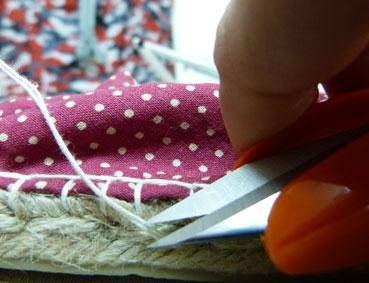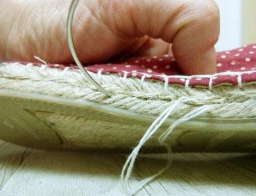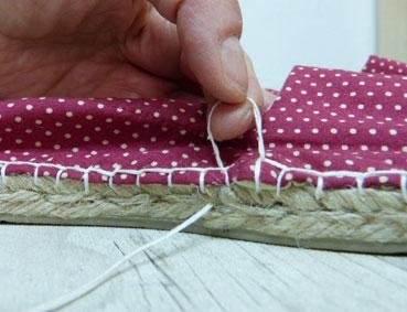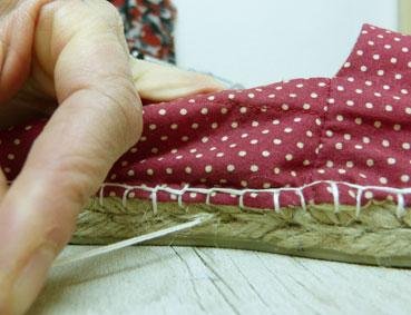 Continuamos cosiendo todo el contorno de la alpargata, sin estirar la tela, mas bien embebiéndola.