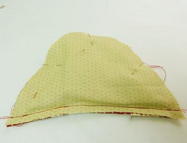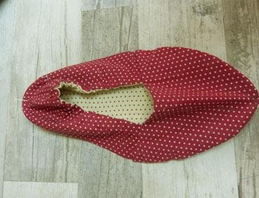 Ahora superponemos cara con cara la capa de la puntera de tejido de forro, claro está, dentro nos quedara la talonera hecha un burruño, pero es pasajero.. , coseremos todo alrededor a una distancia de un centímetro del borde, pero dejaremos un trocito sin coser en un lateral, para poder dar la vuelta.