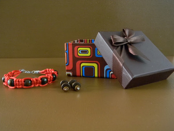 Un elegante conjunto de pulsera realizada con la técnica de macramé y abalorios de madera con sus pendientes a juego.
