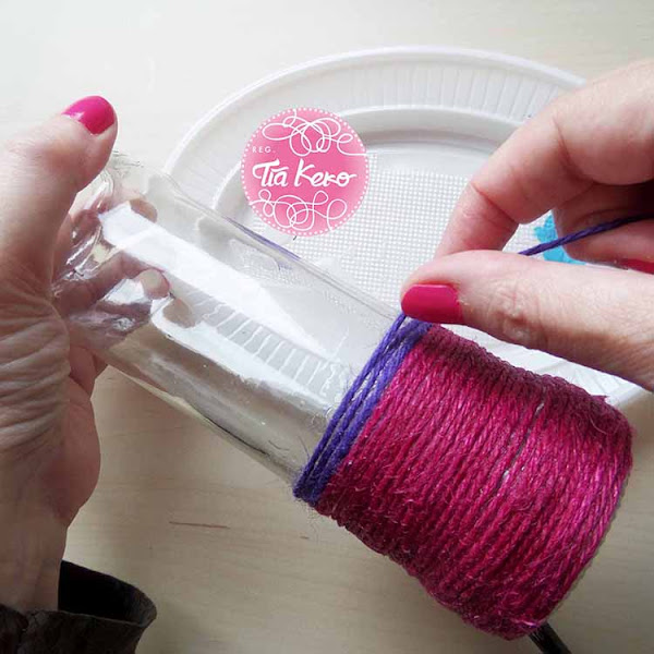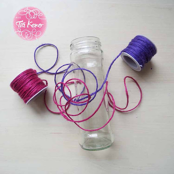 Antes de comenzar tenemos que tener el bote de cristal bien limpio y después podemos comenzar decorándolo con la cuerda de colores. Pensamos que seria muy bonito combinar una cuerda rosa con una cuerda morada, combinando los dos colores. Para ello debemos utilizar cola blanca, lo que haremos será poner una fina capa de cola blanca sobre la zona del bote que vamos a decorar, después pondremos la cuerda de color encima y, por último, vamos a poner otra fina capa de cola blanca para terminar de sujetarla bien.