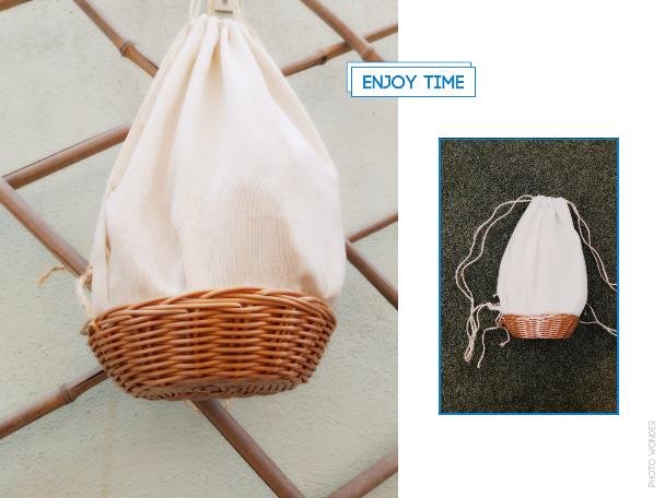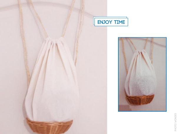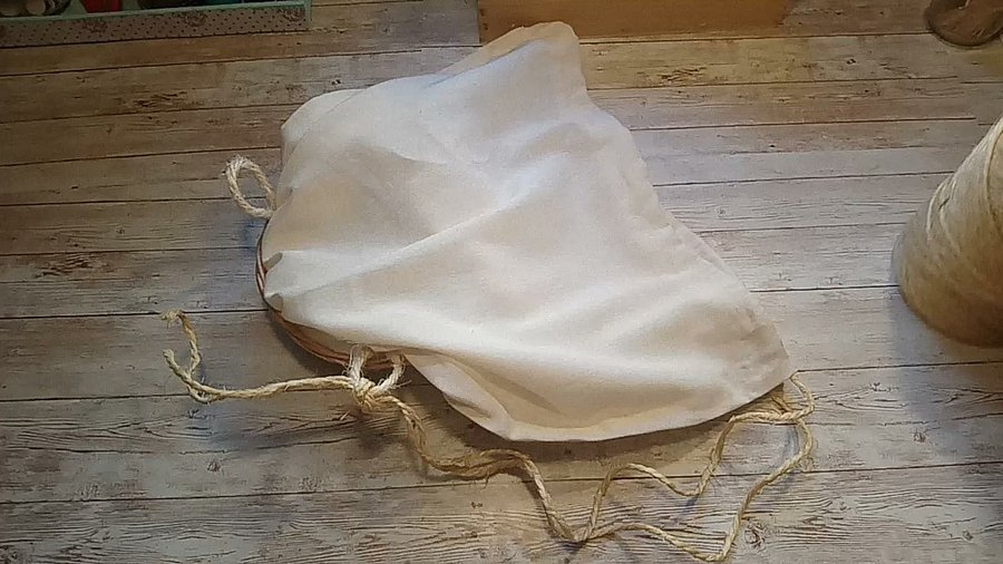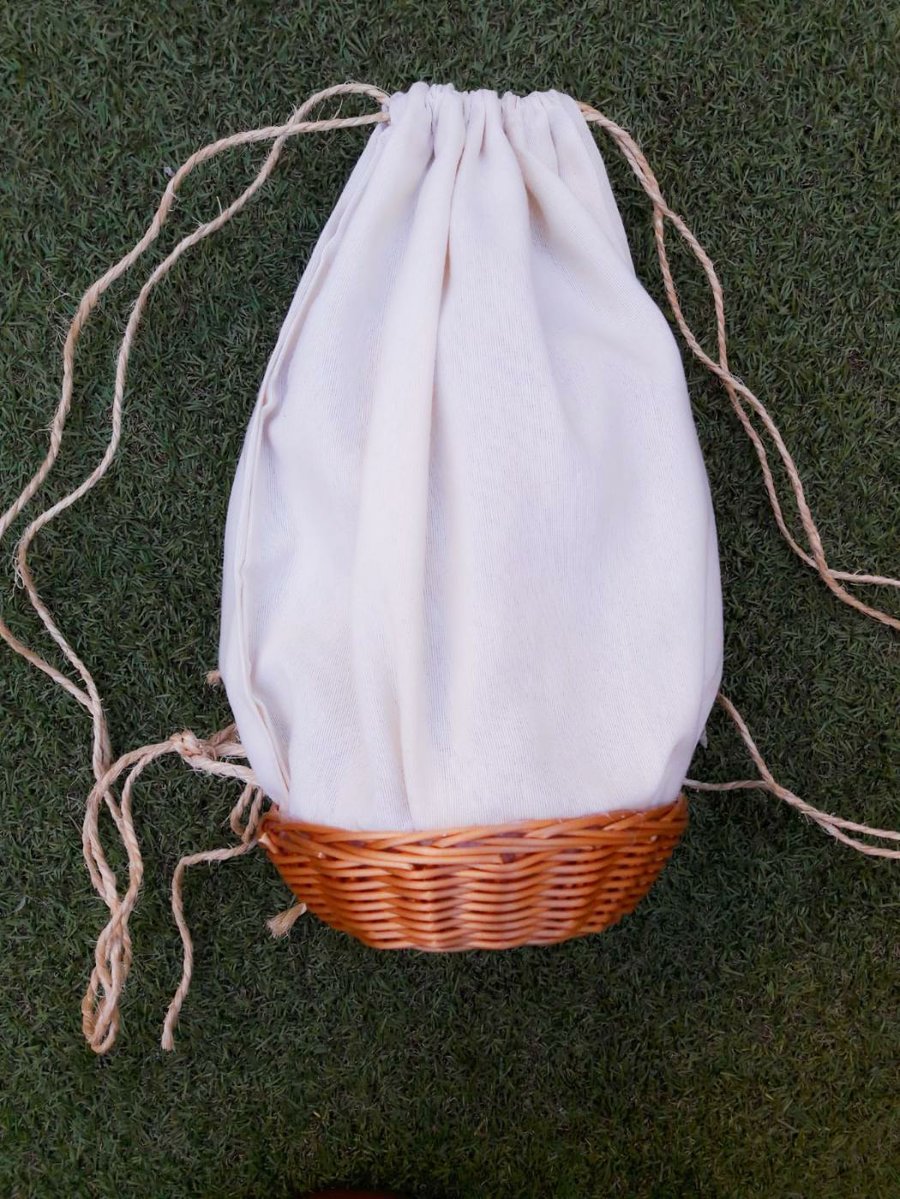Lo primero sera cortar dos cuadrados de tela y unirlos en el lateral, en la parte superior haremos un doblez para poder pasar la cuerda, esta cuerda se atará a otra pequeña que pegaremos entre la cesta y la tela, así como se aprecia en la imagen de abajo.