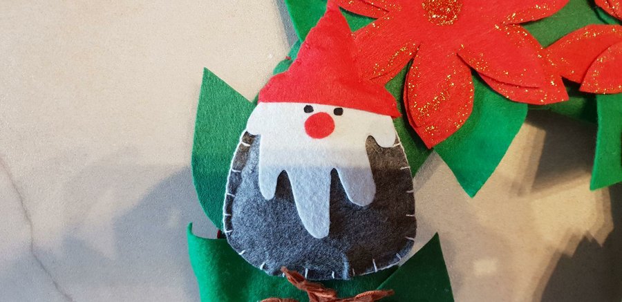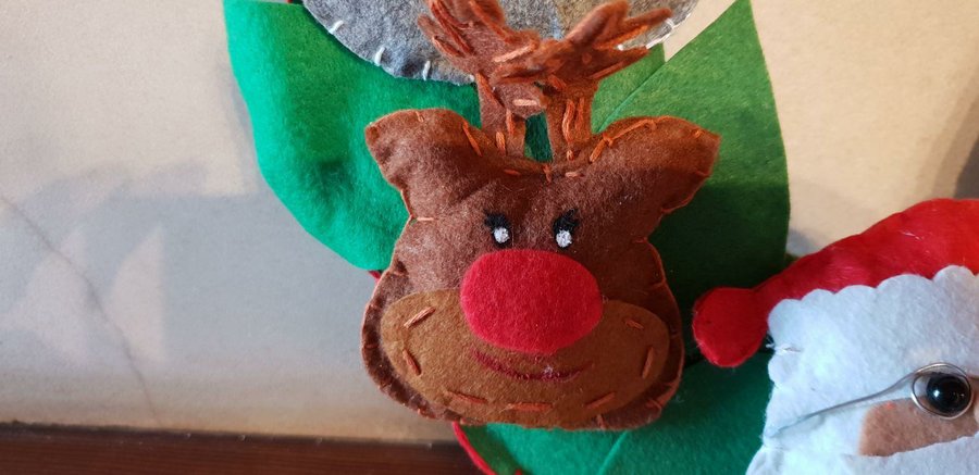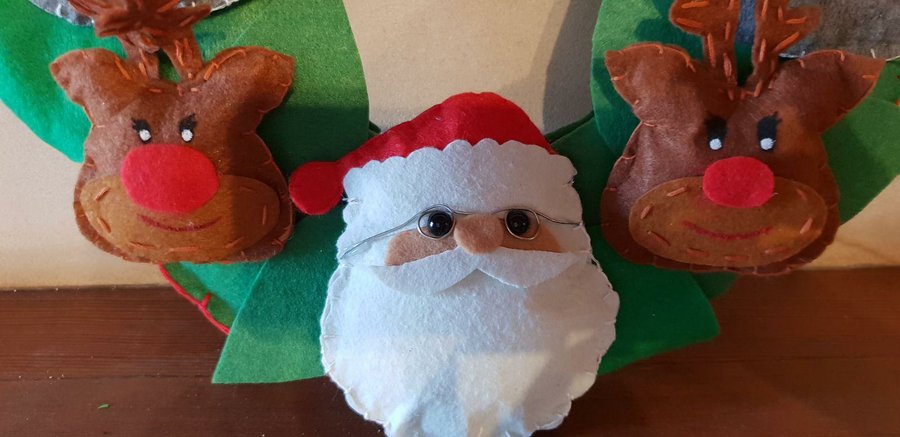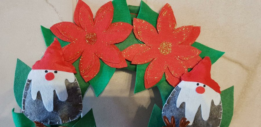 Esta realizada con fieltro y carton ,la base esta hecha con carton y forrada con fieltro verde, alrededor la he cosido,los muñequitos he hecho 2 gnomos ,2 renos y un papa noel.