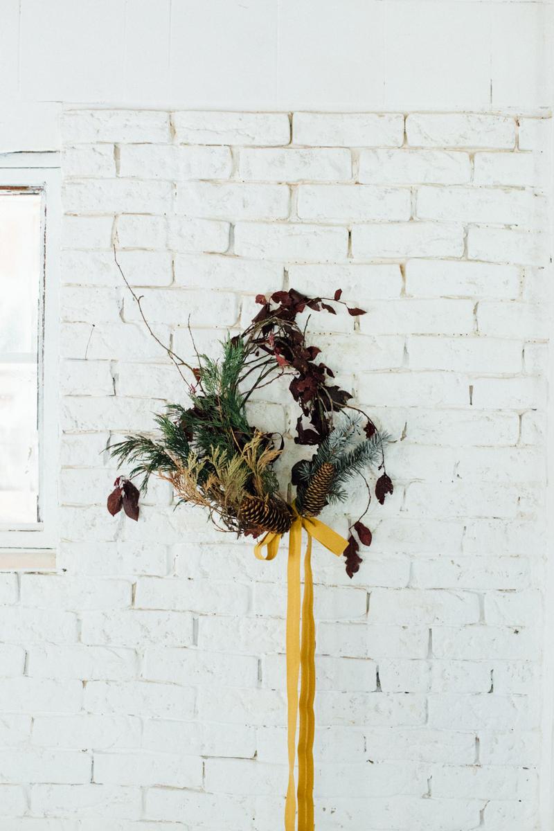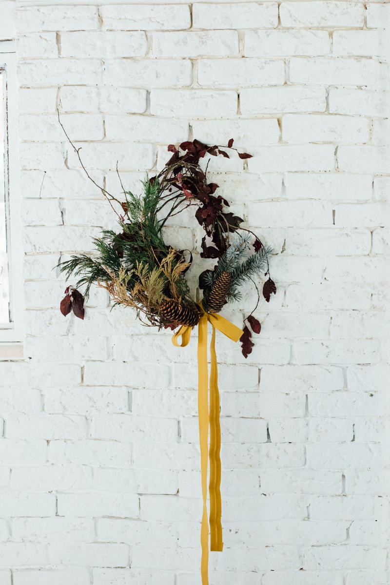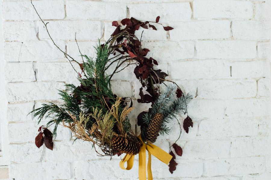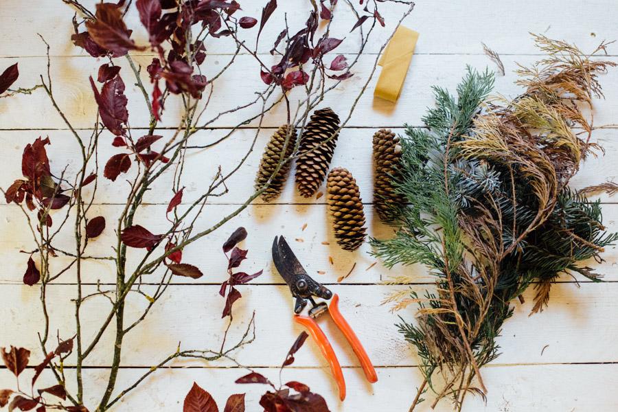 Solo necesitas salir al campo y darte un paseo y recoger todo lo que tengas a mano. Ramas, hojas de diferentes tonos, texturas, piñas, palos, musgo etc. Unas tenazas de jardinería y alambre fino verde.