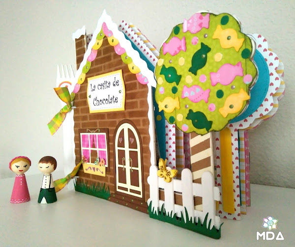 Parte delantera de la casita con su puerta bordeada de lacasitos y las ventanas de piruletas de corazón,la maceta con el girasol y la mariposa. En la parte trasera otras ventanas el perro, la mariquita y la abeja.