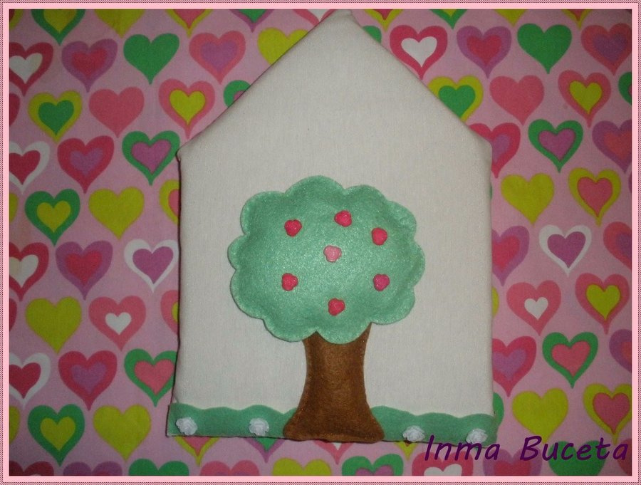 Luego hice las ventanas con fieltro y les hice como si fueran las cortinas,y un árbol de fieltro para la parte trasera de la casa.